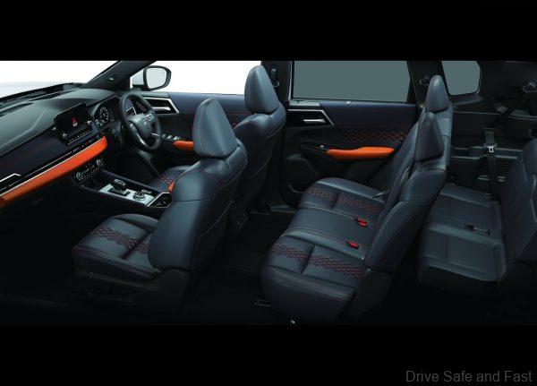 On the front, MMC has evolved the Dynamic Shield for a new generation to create a front-end design with a sense of presence. Seen from the side, the large-diameter 20-inch wheels along with the muscular fender flares that house them combine with D-pillars inspired by the vertical tail of airplanes and a floating roof to conjure an image of powerful yet crisp road performance. The rear side of the all-new Outlander features tailgate design comprised of a hexagon motif, evoking the styling of classic, off-road heritage models, and the horizontally themed taillights that extend to both edges create a styling that accentuates wideness and stability. Body color can be selected from a total of 10 colors including the vivid, crystalline, high brightness Diamond Color series – Red Diamond, White Diamond, and the new Black Diamond.