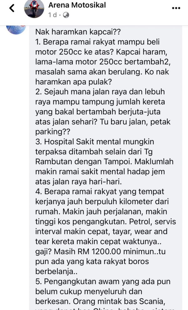 Understandably, the call to ban ‘kapcais’ was not taken well by the owners, majority of whom are from the lower and middle-income group. These are the people who rely on motorcycles to go to work, hence banning them is basically taking away their livelihoods. That is the last thing we need, especially in these trying times. What do you think?