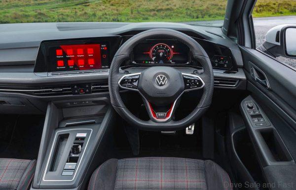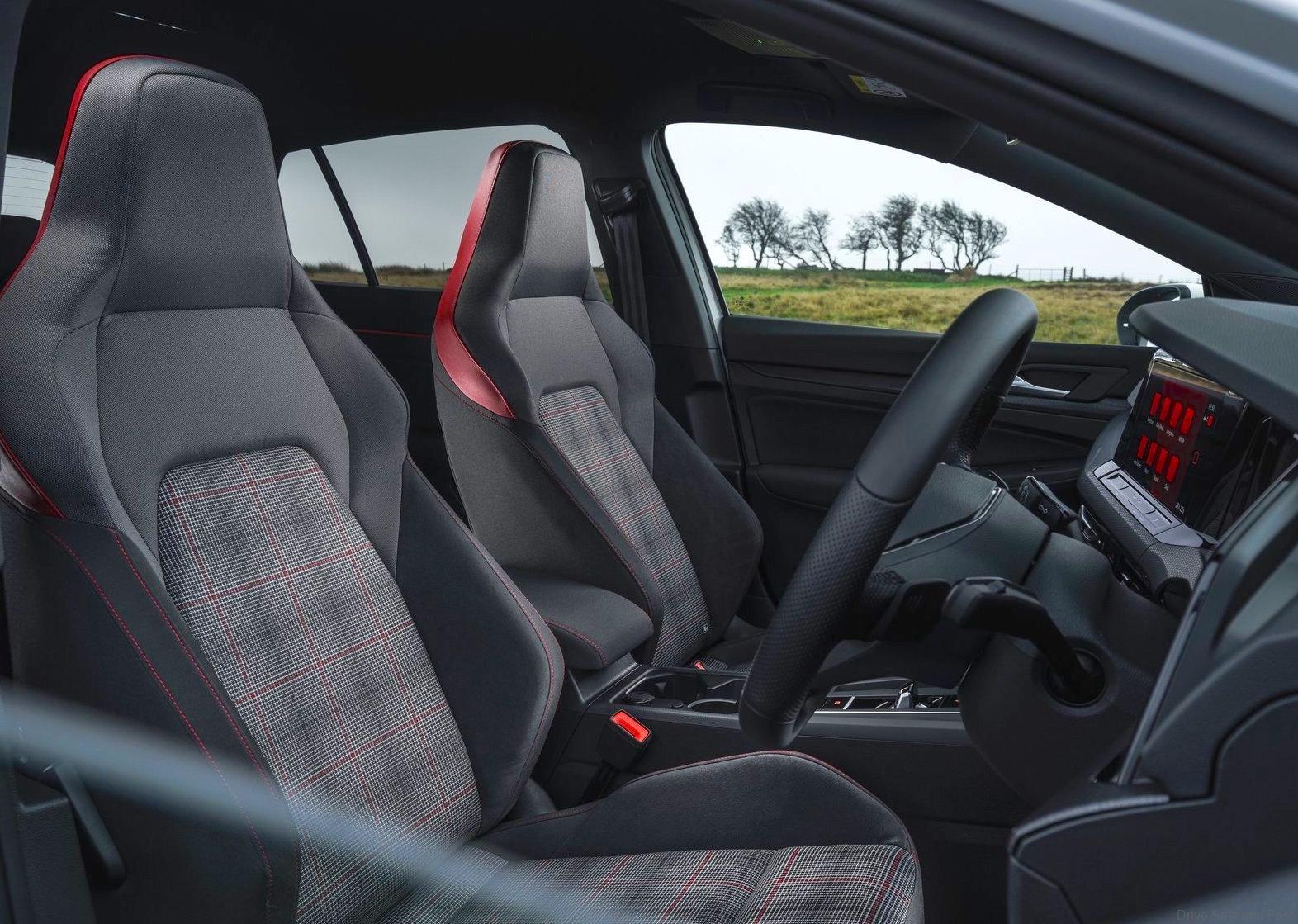 On the inside, the Volkswagen Golf GTI’s sports seats are clad in a new iteration of the Golf GTI’s distinctive Jacara check cloth, while the sports steering wheel is leather-wrapped and heated, with paddle shifters for the DSG-equipped variant.