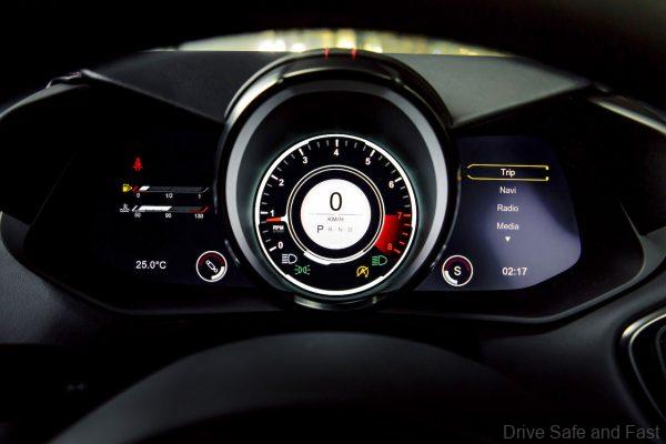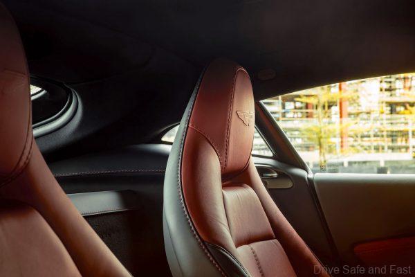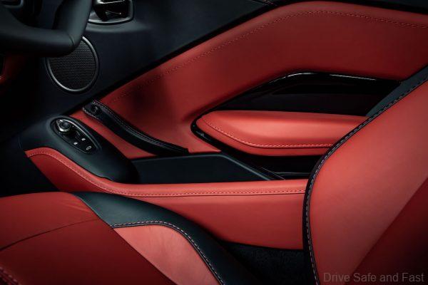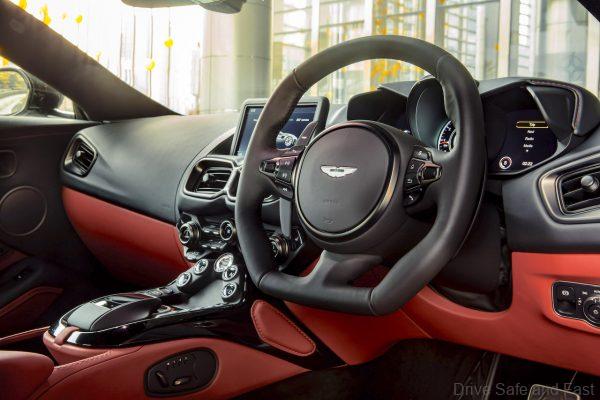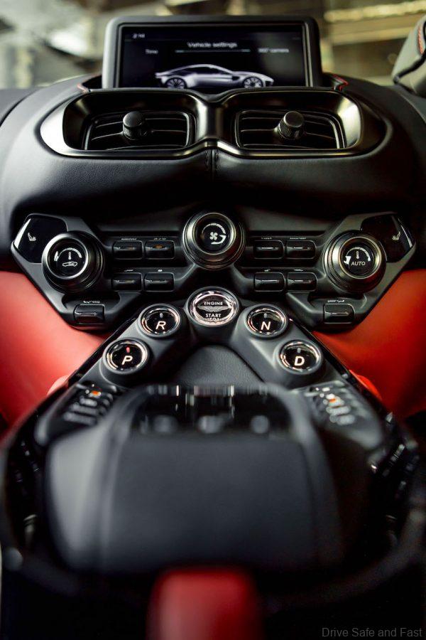 Controls like the new designed sport-orientated gearshift paddles are optimally positioned. Likewise, the gear selection buttons are uniquely placed in the centre console, with the Aston Martin Audio System, 8” LCD screen and integrated satellite navigation all impressively reconfigured around the driver. While duotone environment, the mix of Onyx Black and Chancellor Red, suggests an exciting pleasure of driving related to the heritage of sports cars.