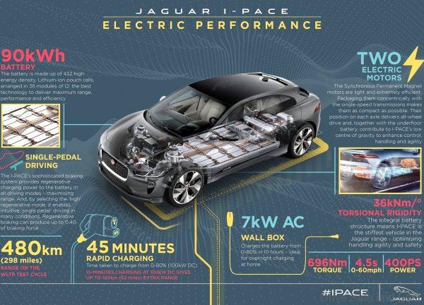 A suite of smart range-optimizing technologies includes a battery pre-conditioning system: when plugged in the Jaguar I-Pace will automatically raise (or lower) the temperature of its battery to maximize range ahead of driving away.
