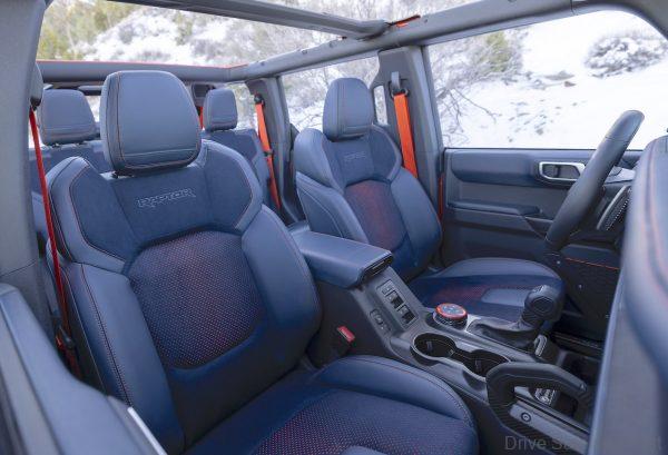 Owners can opt for upgraded features such as all-new laser-perforated Black Onyx Neo suede seats, vinyl-wrapped instrument panel topper, leather-wrapped outer seat bolsters and carpet flooring. A thicker and sport-contoured steering wheel with magnesium paddle shifters and gloss black Raptor logo center continues the Ford Performance treatment. Ford Performance-designed front seats are unique to Bronco Raptor, designed with aggressive foam side bolsters to help keep passengers firmly seated when the terrain gets nasty. Available Code Orange seat belts provide even more Ford Performance style.