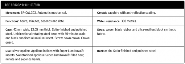 The case is waterproof and houses the BR-CAL 302 self-winding calibre, which can withstand very low temperatures and controls the hour, minute and seconds function, as well as the date.
