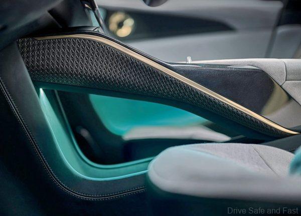 Below the instrument panel a blade of light runs across the cabin, sitting in a ribbed channel that widens at each end to create the air vents. While it appears to be floating, the light is more than decorative and forms part of the human machine interface (HMI). It changes colour to communicate with occupants, for example, if a phone call is received, if the cabin temperature is changed, or to reflect the vehicle’s battery charge status.