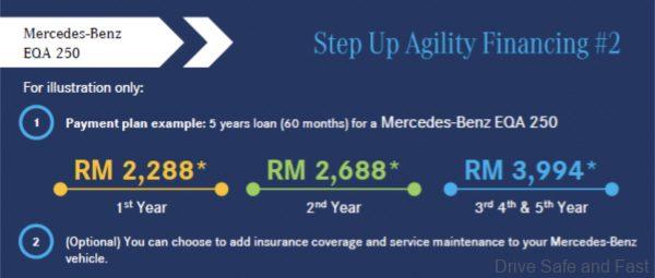 Mercedes-Benz Financial announces Step Up Agility Finance for the newly launched EQA 250 in Malaysia With the highly successful launch of the all-new all-electric EQA 250, Mercedes-Benz Financial today announces the Step Up Agility Financing program to further encourage the nation’s EV adoption. Designed with customers in mind, the financial package enables customers to have regular fixed monthly instalments over a set period, perfectly tailored for individuals who seek luxury, value, unrivalled benefits, and above all, peace of mind behind the wheel.