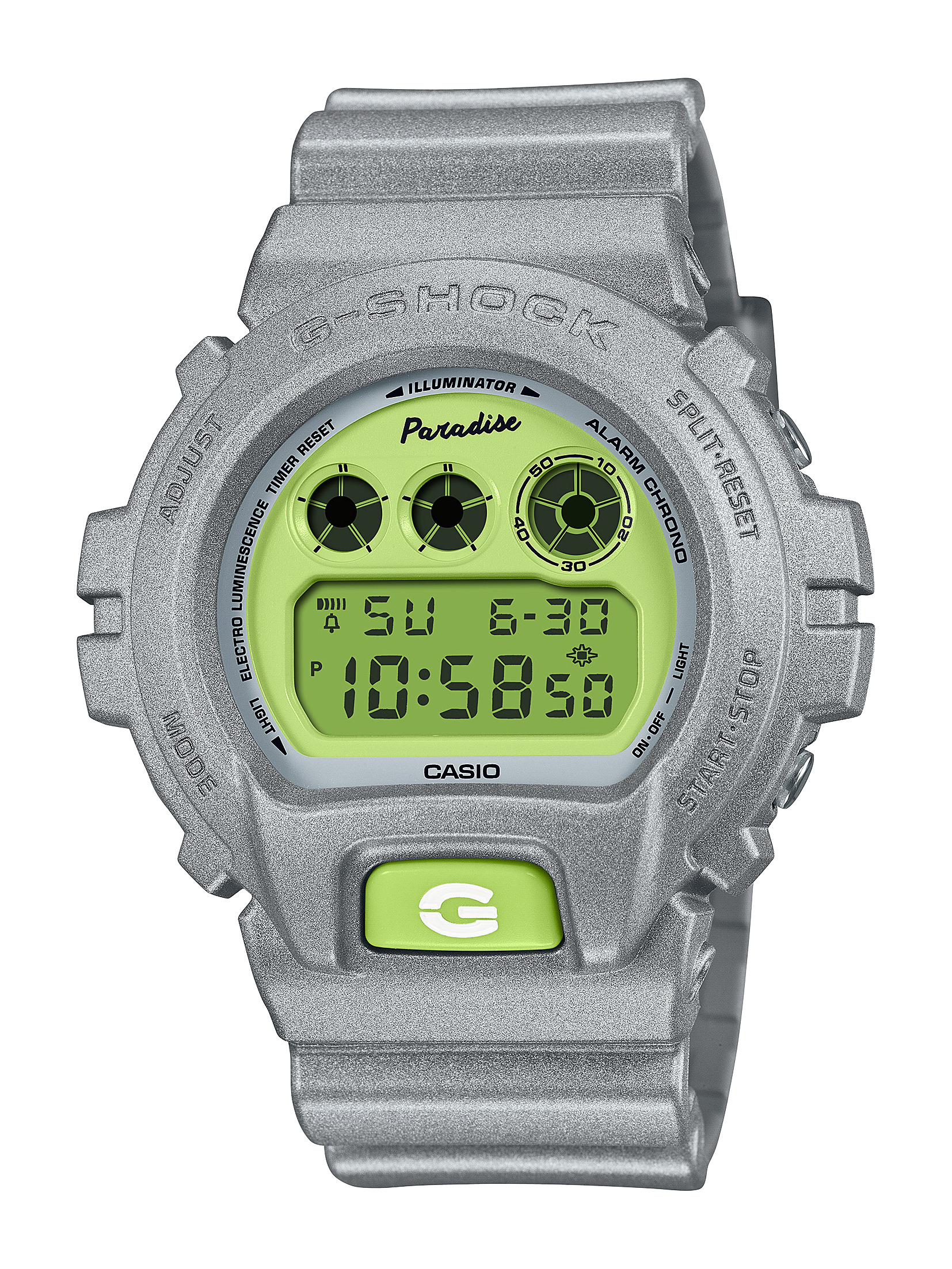 Paradise Youth Club DW-6900PYU21 is based on the DW-6900. The watch exudes futuristic elements by employing the silver-color bezel and band. The light green face and big front button become a good accent. By turning on the backlight, the word “Power Source” emerge. On the back case, the phrase “Guide to the Paradise Highway” is engraved.
