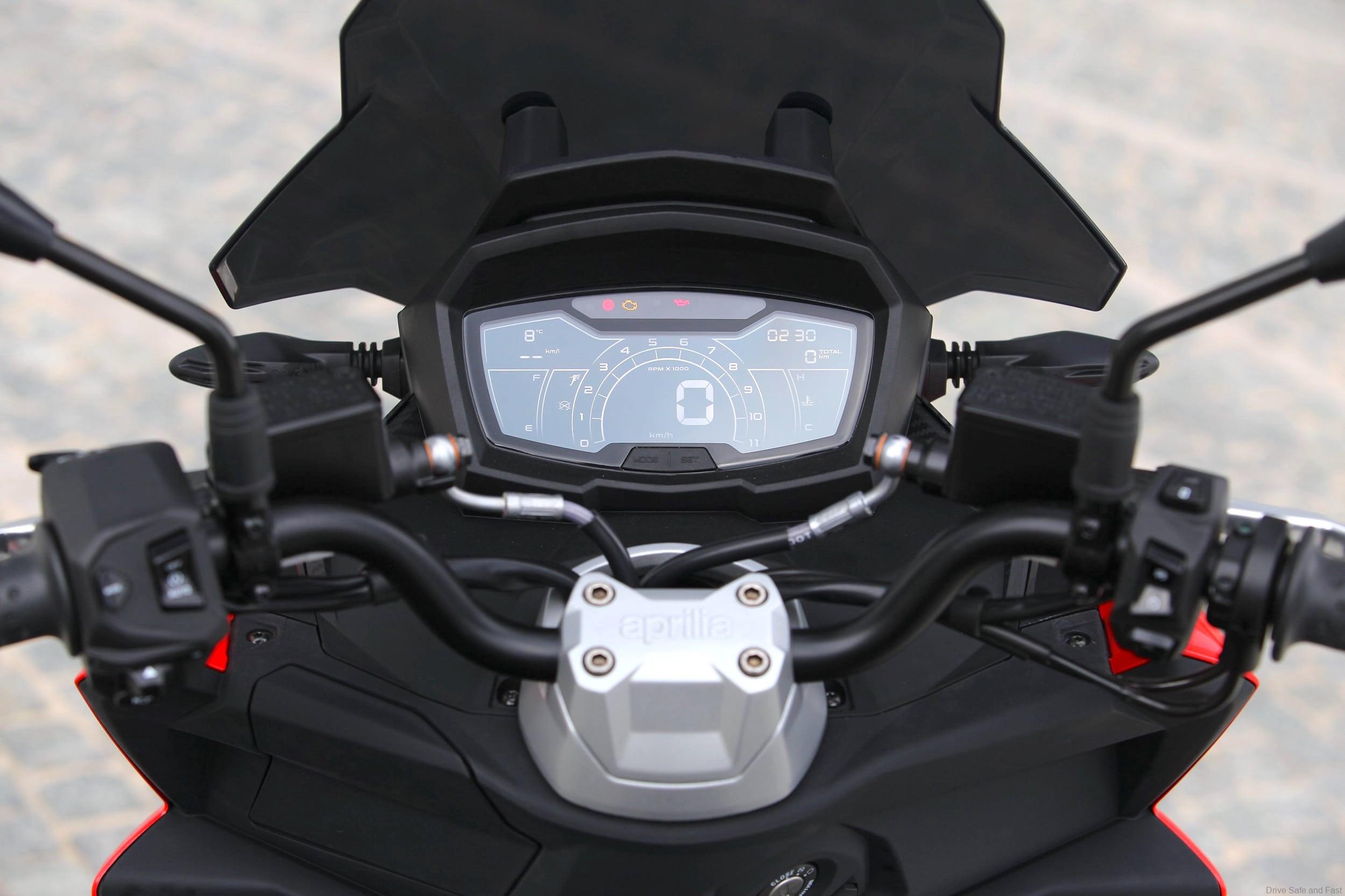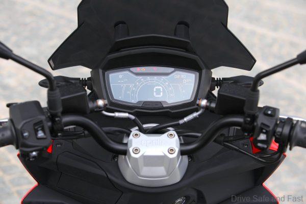 Standing out at the front is the full LED three-element light cluster, typical of Noale sports bikes, as well as the double fairing that emerges to the sides of the shield, but there is also a clear enduro influence, with the suspended windscreen and wide, naked handlebar that contributes to a sense of total control, particularly when maneuvering at low speed in city traffic. The handlebar is fixed to the vehicle with a refined die-cast aluminum riser that bears the Aprilia logo, while the ergonomic and intuitive handlebar control sets are clearly motorcycle-derived.
