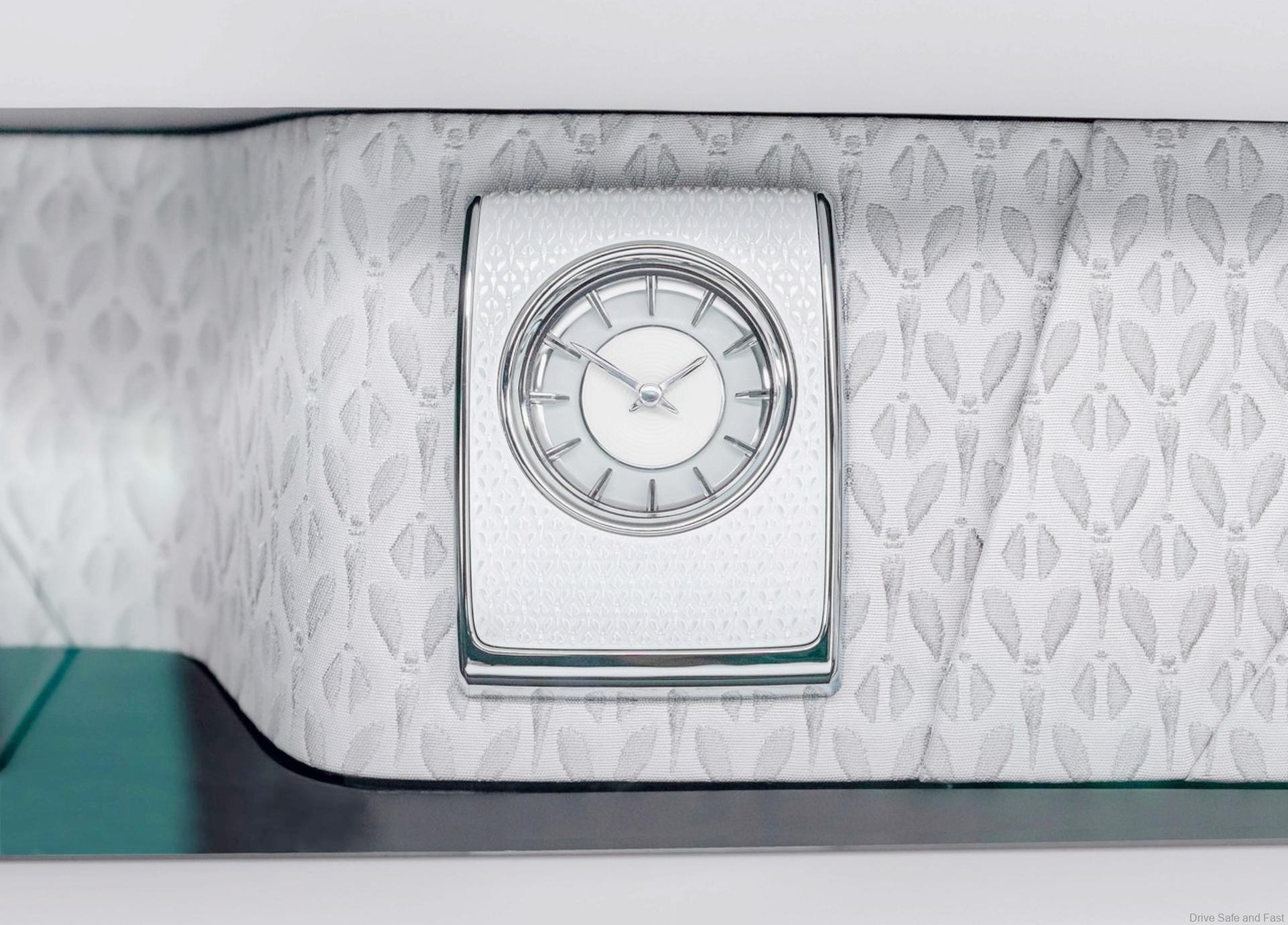The same design on the two-tone fabric also appears on the Phantom’s dashboard timepiece. The surround is made of a 3D printed ceramic which is set to an iced finish woodset. The Rolls-Royce Starlight Headliner in the Phantom Platino has a unique star pattern designed to draw the eye rearwards with whimsical shooting stars following the sweeping arc of the pattern.