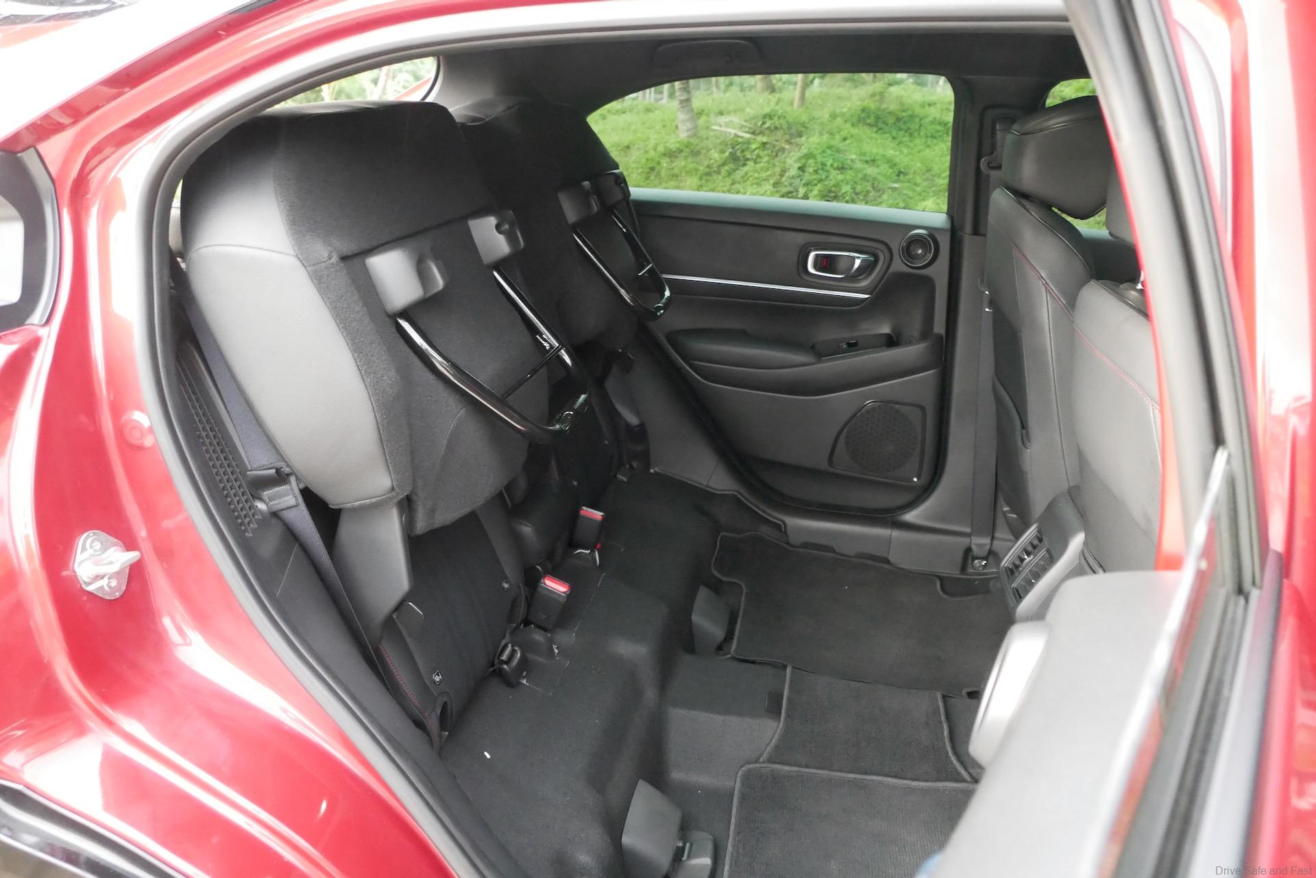 There are now two USB-A charging ports and rear vents for passenger convenience and comfort, a big upgrade from before. A nice little upmarket feature in the Thai spec HR-V is the fixed sunroofs for the front and rear passengers. The front glass features a sliding cover while the rear glass gets two separate and detachable framed cloth pieces to blot out the sun. A storage bag is supplied, but no dedicated storage area exists for these pieces, so the whole storage bag will have to be chucked in the boot. This version also comes with a black headliner material and two capacitive LED room lights at the centre of the car’s roll bar. The design of the rear door card has changed drastically this generation. There’s a smaller and shallower cupholder this time around but it is moved to a more accessible location. They’ve also included 2 speakers in these door cards. Seatback storage this time around includes a little felt-line pocket for smartphones – large enough even for an iPhone 11 Pro Max.