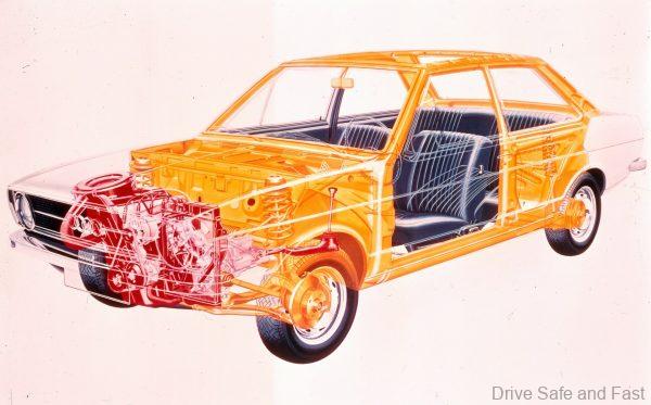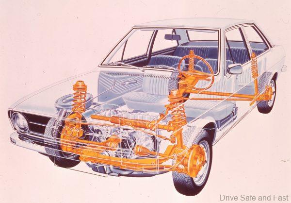 The Audi 80 was considered extremely lightweight at just 835kg for the base 2-door model. With a wheelbase of 2.47m and an overall length of just 4.18m, this was an overall compact vehicle. Still, Audi engineers worked hard to introduce innovations within this constrained package. Suspension engineers introduced a negative steering roll radius for the first time in a mass-produced European vehicle, which improved stability during braking.