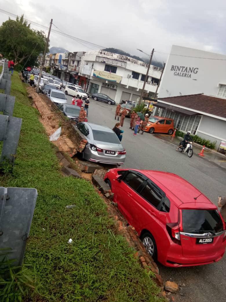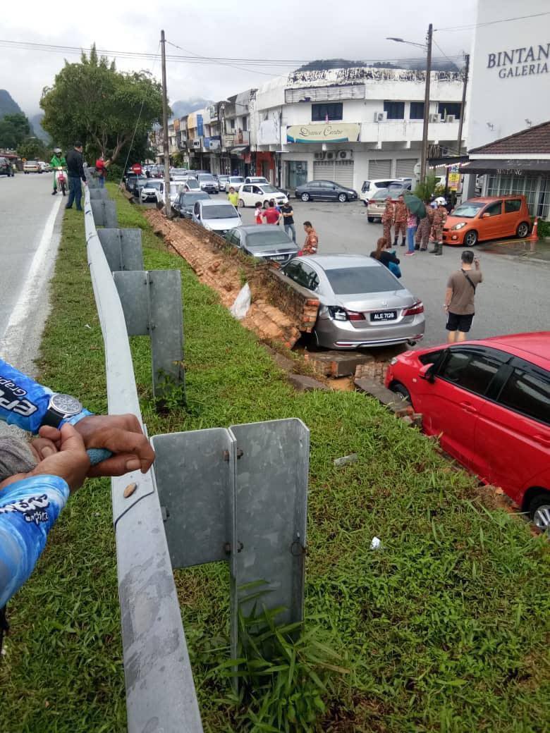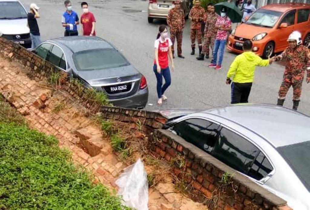 Several cars were left damaged when a retaining wall located near Ipoh Garden collapsed during heavy downpour.