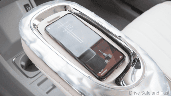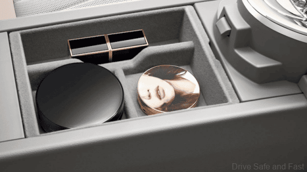 The delicate theme continues inside the Ballet Cat with its many retro features with a modern touch. Featuring two screens in an oval shaped block for driver systems and infotainment, a wireless charging pod also in an oval shape and ambient lighting, 10 speakers and a makeup compartment in the center tunnel of the car.