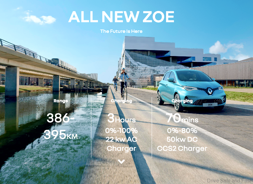 Renault makes a bold claim with the Zoe by saying “the future is here” on their website describing the Renault Zoe. This car will also feature a driving range of 386 to 395km and can charge from 0 to 100 percent in just 3 hours using a 22kW AC charger.