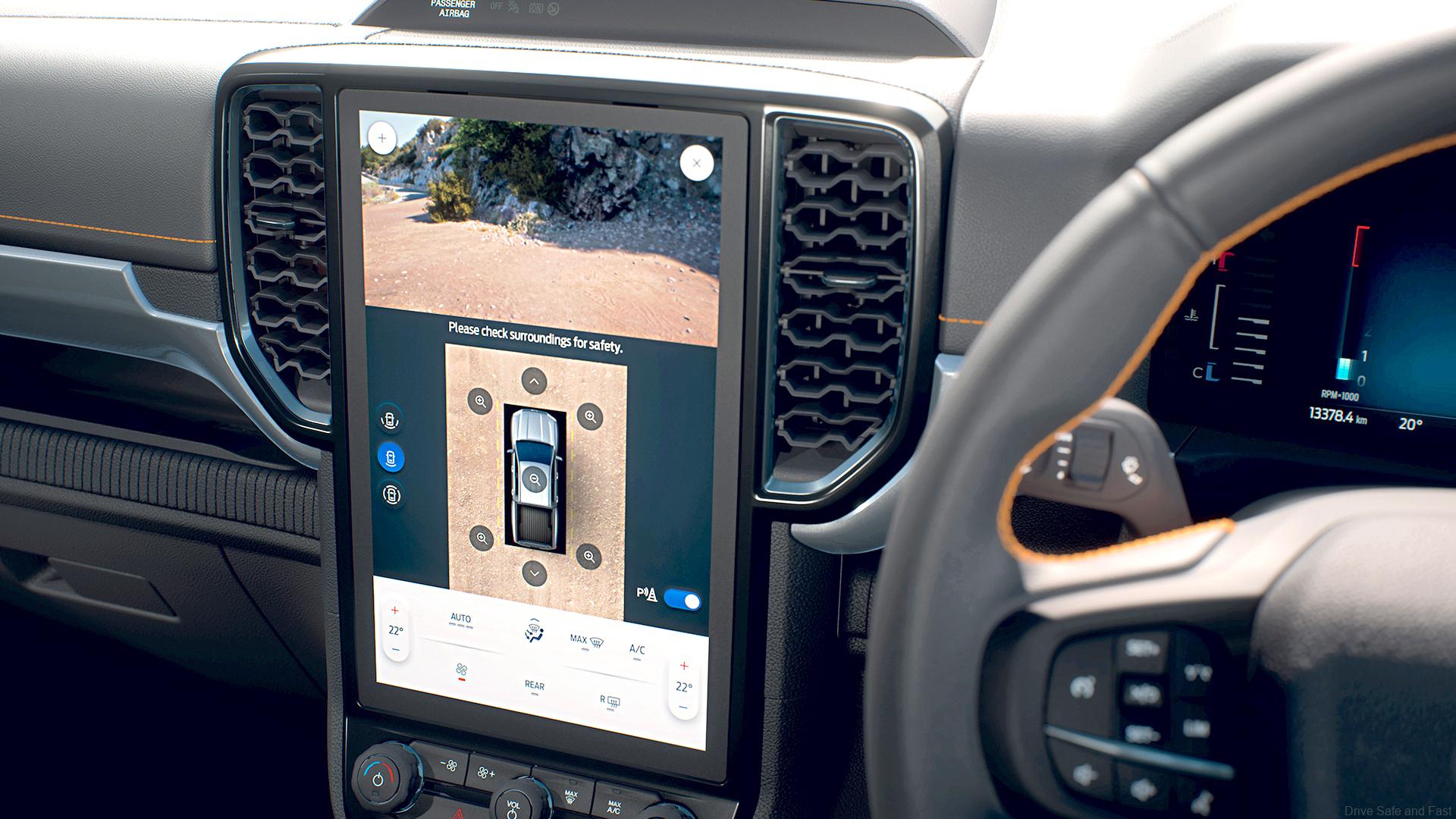 In the event of a potential frontal collision, the next-gen Ford Ranger’s forward collision warning system will alert the driver with an audible warning tone, which also mutes the audio system.