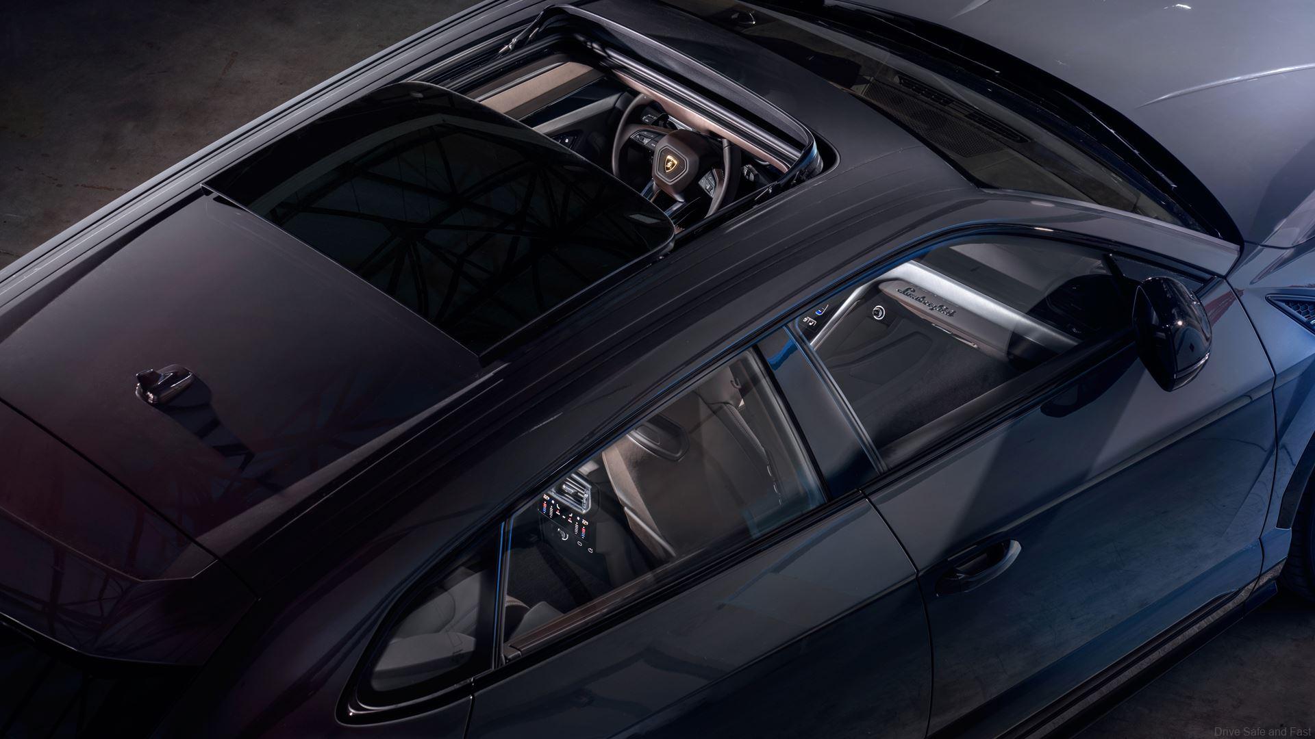 A new front bumper design adopts more refined lines and incorporates a new matt black-painted stainless steel skidplate as standard, complemented by the black lines of the front grille. Five further style configuration options combine body color, shiny black, and carbon fiber components in shiny and matt finish, allowing markedly individual configurations for the Urus S. A new lightweight carbon fiber painted bonnet comes with matt black air vents, with optional finishes to the vents in gloss black, body color or carbon fiber in shiny or matt finish. An optional visible carbon fiber roof lends an athletic elegance to the new Urus S.