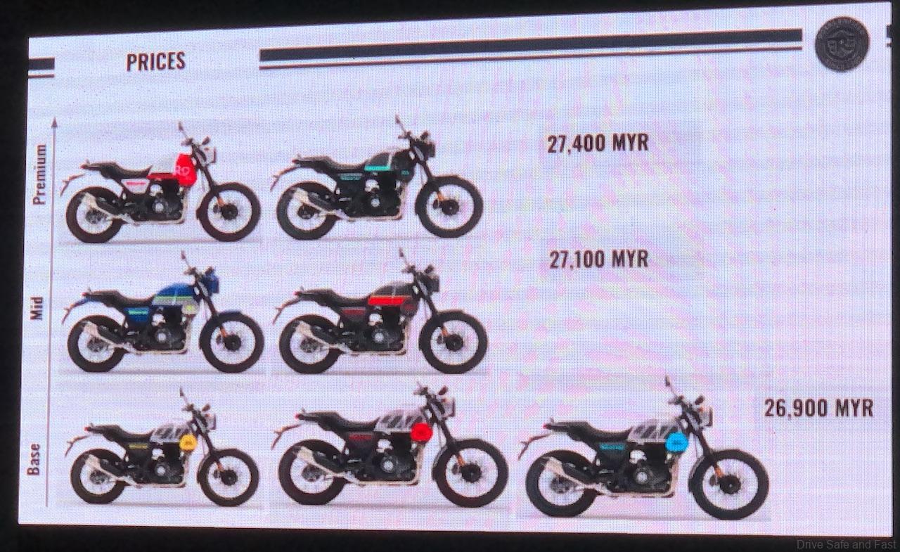 The prices of the motorcycles are as follows:-the Premium Variant is priced at 27,400 MYR, the Mid Variant is priced at 27,100 MYR, the Base Variant is priced at 26,900 MYR.