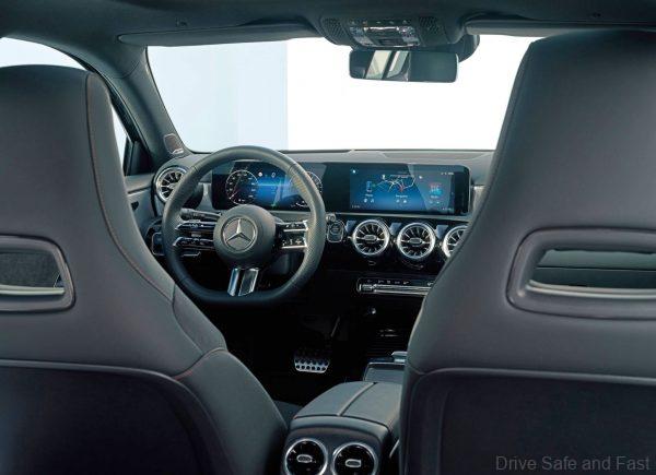 Inside, the centre console has been slightly redesigned, but the same dual display setup returns with a 10.25″ in the centre and either a 7″ or 10.25″ driver display optional. The steering wheel design has also been updated to the more contemporary look. It is wrapped in Nappa leather as standard. A new high-quality comfort seat with 3D embossed Artico upholstery is available. New interior colours are also available on certain trim levels. The AMG Line trim returns with bright brushed aluminium trim and red contrast stitching.