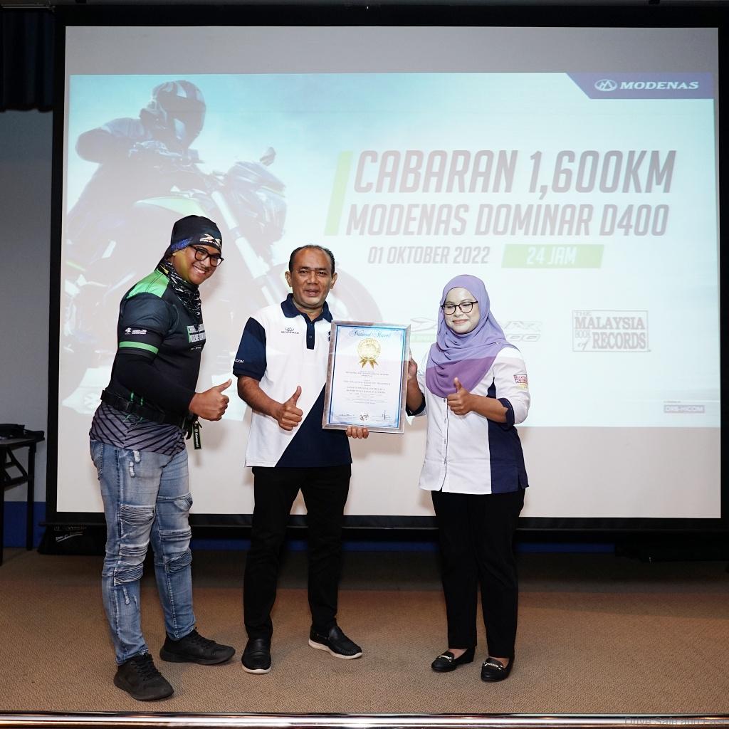 Modenas CEO, Roslan Roskan, said, “This is the second time for Modenas to organise a 24-hour, 1600km endurance ride and through this successful collaboration, the event managed to set a new Malaysia Book of Records attempt for the “Longest Distance Covered by A Motorcycle Convoy In 24 Hours.”