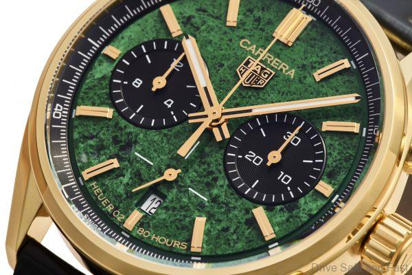 Under a dome shaped sapphire glass, the unmistakable dial with its elegant tri-compax layout, takes on a brand-new style however, in a lush shade of green. Although seldom known for using gemstones as their dial material, TAG Heuer decided to highlight its creative audacity, on top of its watchmaking expertise, by creating a watch dial using jade-albite (also known as maw sit sit). This bold move is a refreshing update for the Carrera collection, yet at the same time is also a nod to the original 1963 design by Jack Heuer, by retaining its finely balanced design, complete with a slim bezel, angled lugs, classic pump-style pushers, as well as a minimalist seconds-counter and discreet date window at the 6 o’clock position.