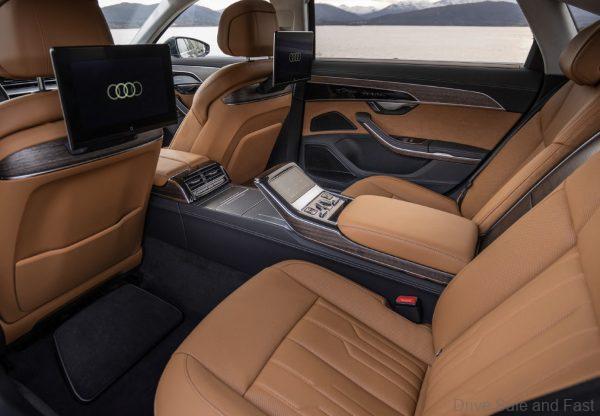 The Audi A8 L is pretty well equipped but is missing a panoramic sunroof option, which is usually included on its rivals for less money. There are two 10.1″ displays for rear passengers, a Bang & Olufsen sound system, seat ventilation and massage function, and loads of ADAS features as standard.