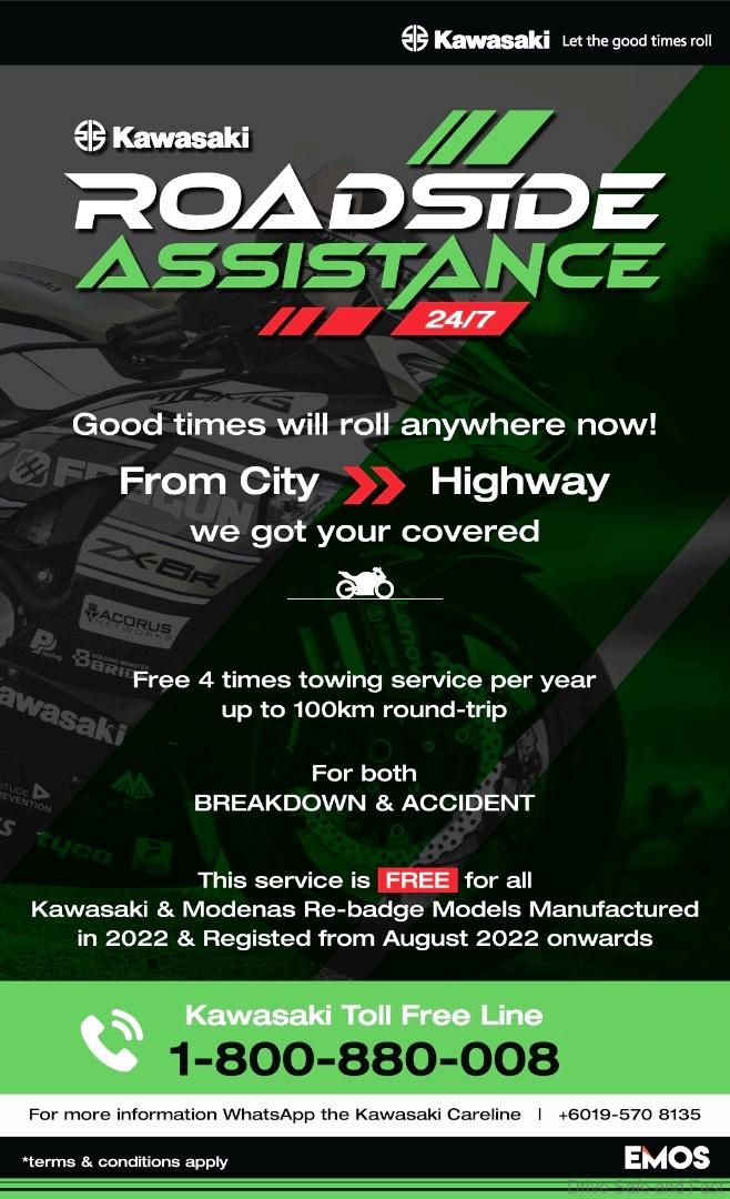 Kawasaki owners who find themselves in need of towing assistance, this roadside assistance is available 24/7 and can be reached at 1-800-880-008. Alternatively, one can visit the Kawasaki Official Website linked here or contact the Kawasaki WhatsApp careline at +6019-570 8135.
