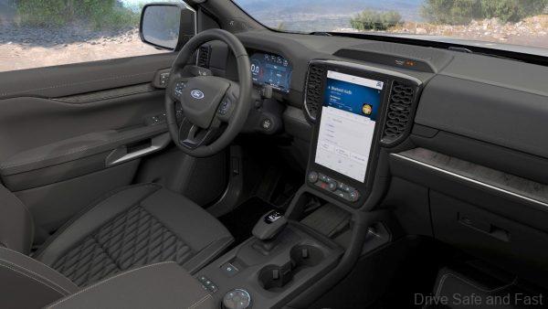 The Ford Ranger Platinum comes with the same dual 12″ display layout that fully replaces traditional gauges in the cockpit. The infotainment screen is portrait oriented and runs SYNC 4A. The audio experience is provided by B&O and features 8-speakers in total. The cockpit of the Ranger Platinum features a wireless charging pad, a FordPass Connect modem and can be updated with Ford Power-Up software updates over time. The front seats also come with 10-way power adjustments as well as heating and cooling functionality.