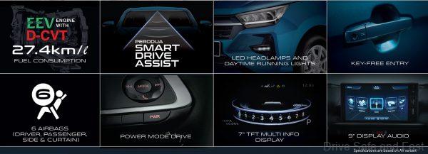 The top spec Axia AV (estimated price RM49,500) adds 2-tone semi-leather upholstery for the seats, a 7″ TFT multi info display, and a 9″ display audio infotainment system. The digital elements seem to be the same as the ones found on the new Myvi facelift and Ativa. There’s no mention of which trim levels get Perodua Smart Drive Assist features, but it is mentioned on the brochure.