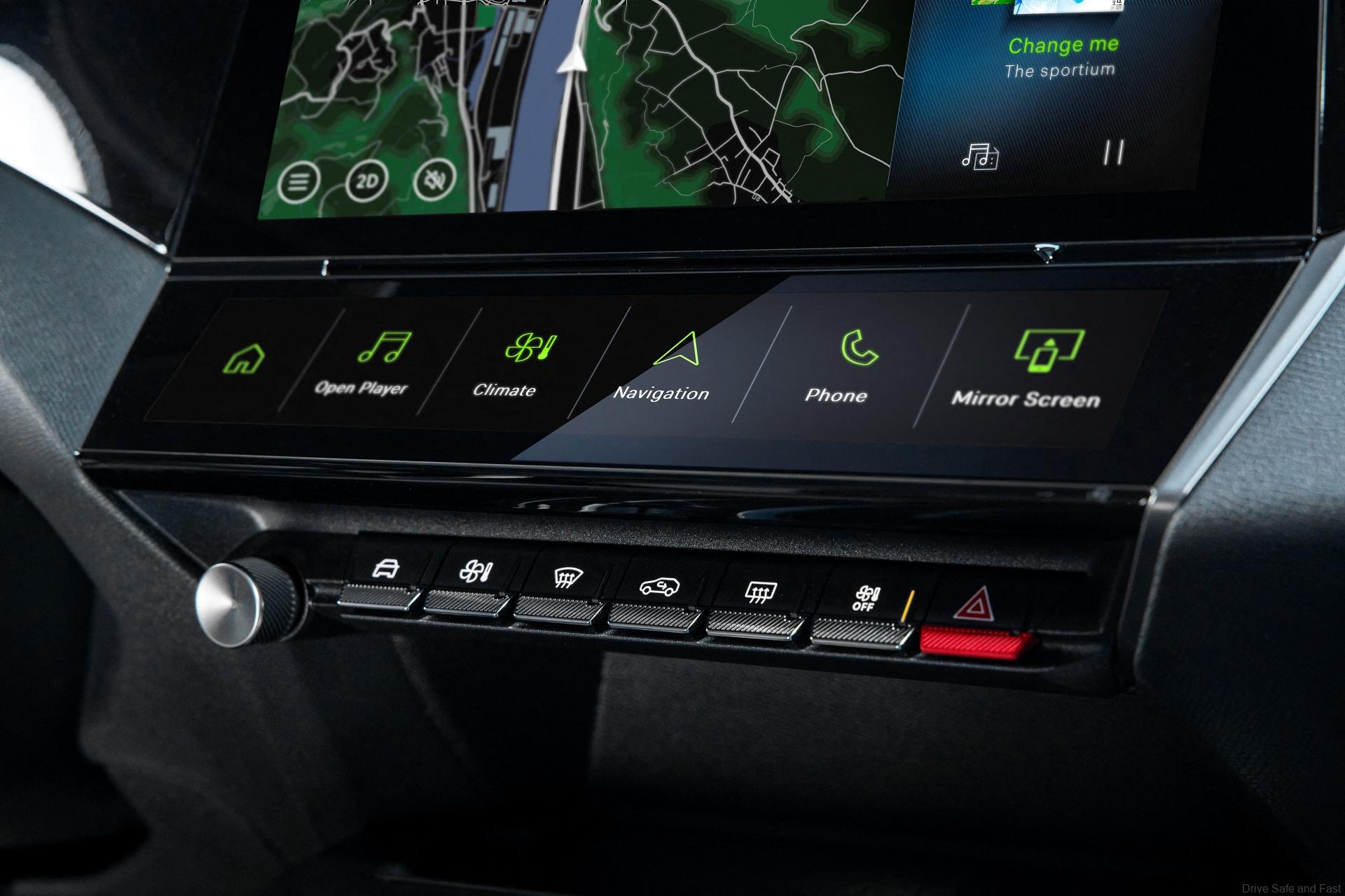 The interior of the all new Peugeot 408 is equipped with the latest generation Peugeot i-cockpit with the instantly recognizable compact steering wheel design and a new centre console layout with what appears to be two touchscreens one on top of the other for infotainment and systems respectively with switches below for convenience.
