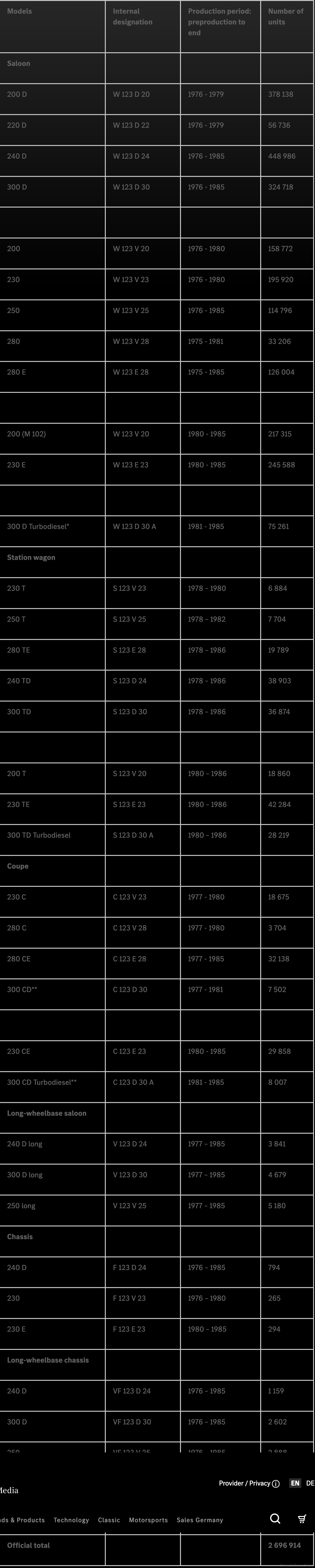 There was also a station wagon known as the S123 (the first wagon from the brand), a coupé known as the C123, a long-wheelbase limo known as the V123 and as a rolling chassis which was modified for use as ambulances and hearses.