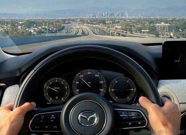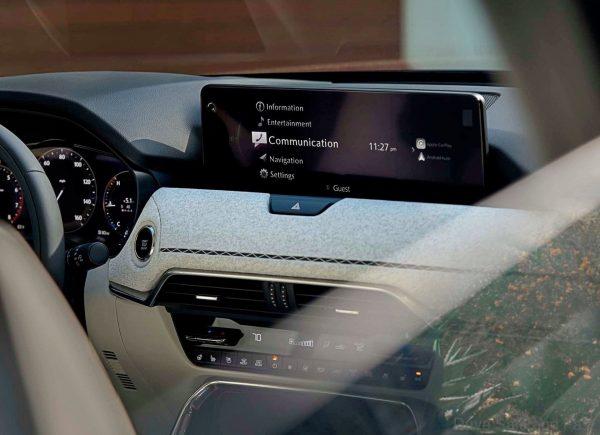 The car has standard i-Activsense safety features like Smart Brake Support, Blind Spot Monitoring, and Mazda Radar Cruise Control. It also has a large 12.3″ display with physical buttons, and an available See-Through View monitor to assist with parking. The goal is to provide a seamless experience with technology and comfort while allowing the driver to feel in control.