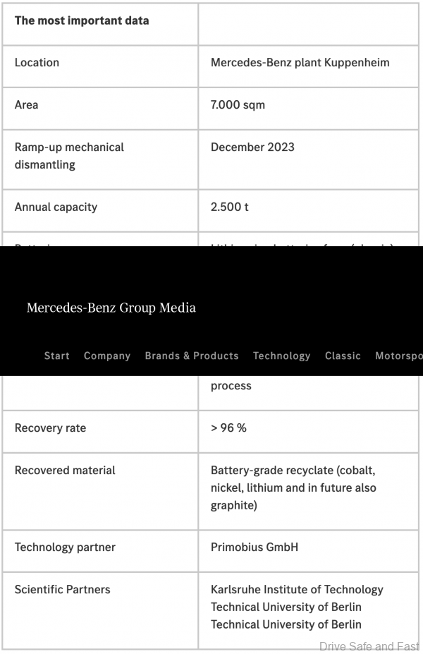 The pilot plant is expected to have an annual capacity of 2,500 tonnes. The recovered materials will be fed back into the recycling loop to produce more than 50,000 battery modules for new Mercedes-Benz models. Based on the findings of the pilot factory, production volumes could be scaled up in the medium to long term.
