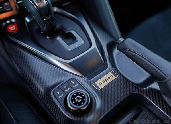 The Nissan GT-R T-spec comes with NISMO carbon-ceramic brakes, gold-painted NISMO RAYS 20″ forged wheels, special badges, dark Mori Green upholstery, semi-aniline leather and suede upholstery for the front seats, NISMO-tuned Vehicle Dynamic Control and wider front fenders. Two exclusive colours from GT-R’s historical palette are available – Millennium Jade and Midnight Purple.