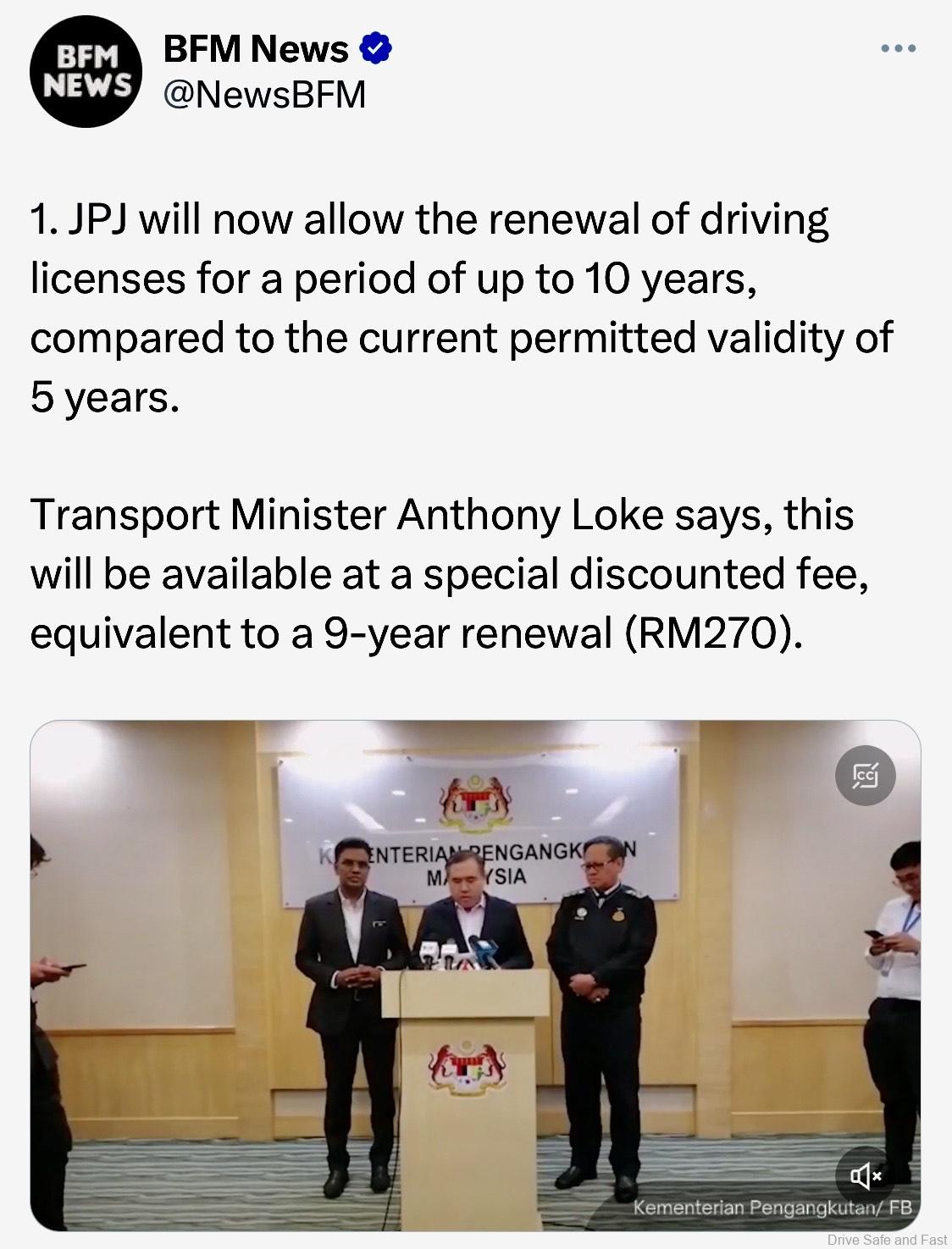 Good news again from YB Anthony Loke and our Jabatan Pengangkutan Jalan Raya. Malaysian Motorists can now renew their driving licence for up to 10 years and those choosing this option will only need to pay for nine of those years as they will be given year ten for FREE.