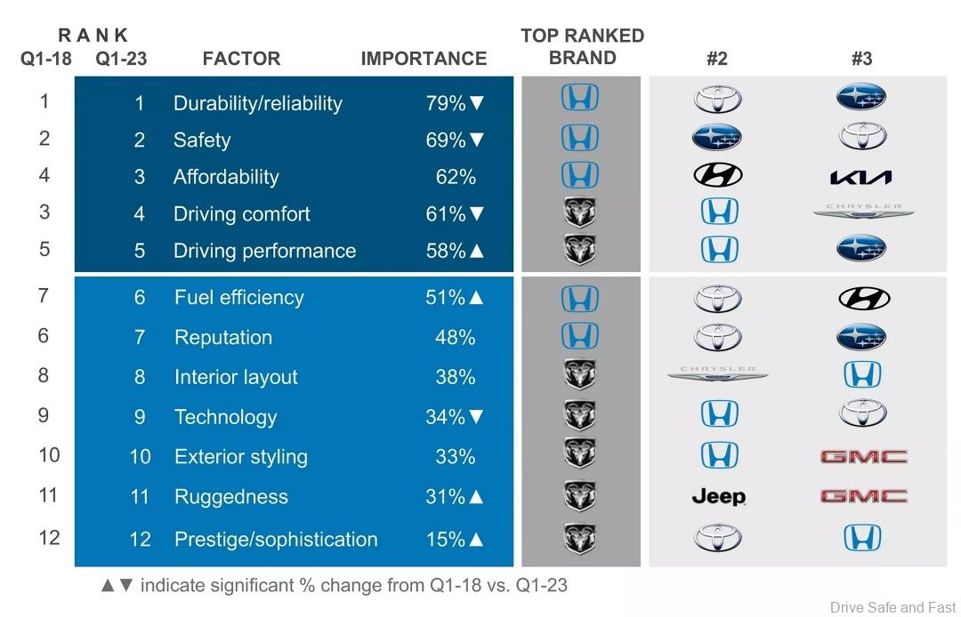 While Ram excelled in factors driving non-luxury consideration, occupying the top spot in driving comfort, driving performance, interior layout, exterior styling, prestige/sophistication, technology and ruggedness, the top three most important factors, durability, safety and affordability, were dominated by Honda, which also dominated in terms of fuel efficiency and reputation.
