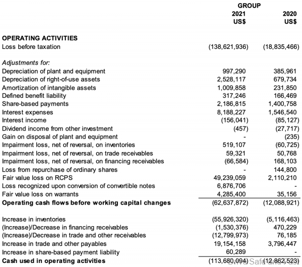 Unsurprisingly, “cash used in operating activities” was negative USD114 million (which is about RM524 million) in 2021 alone. This implies a 9X increase in operating burn.