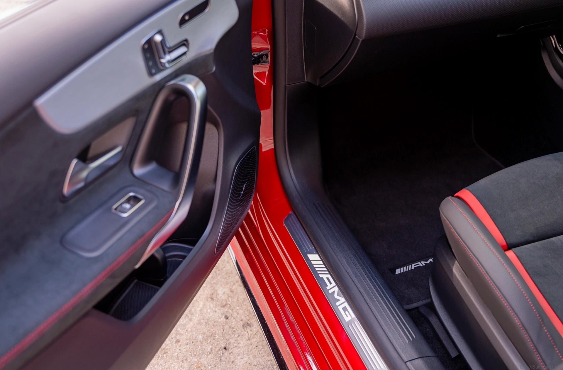 These AMG models come with a revised look featuring an AMG-specific radiator grille, new round badge with the AMG emblem instead of the 3-pointed star, new 19″ wheel designs, rear spoiler lip, lights. Both models come with red-painted brake calipers and Adaptive Highbeam Assist Plus. Inside, both models come as standard with Artico man-made leather and Microcut AMG upholstery, aluminium AMG Design trim elements in black and silver, red seat belts, AMG floor mats, 64-colour ambient lighting, and AMG illuminated door sills. The same improvements to MBUX have been made but with AMG designs. USB ports too come with the same upgrades as the rest of the A-Class range. The AMG vehicles enjoy Burmester surround sound.