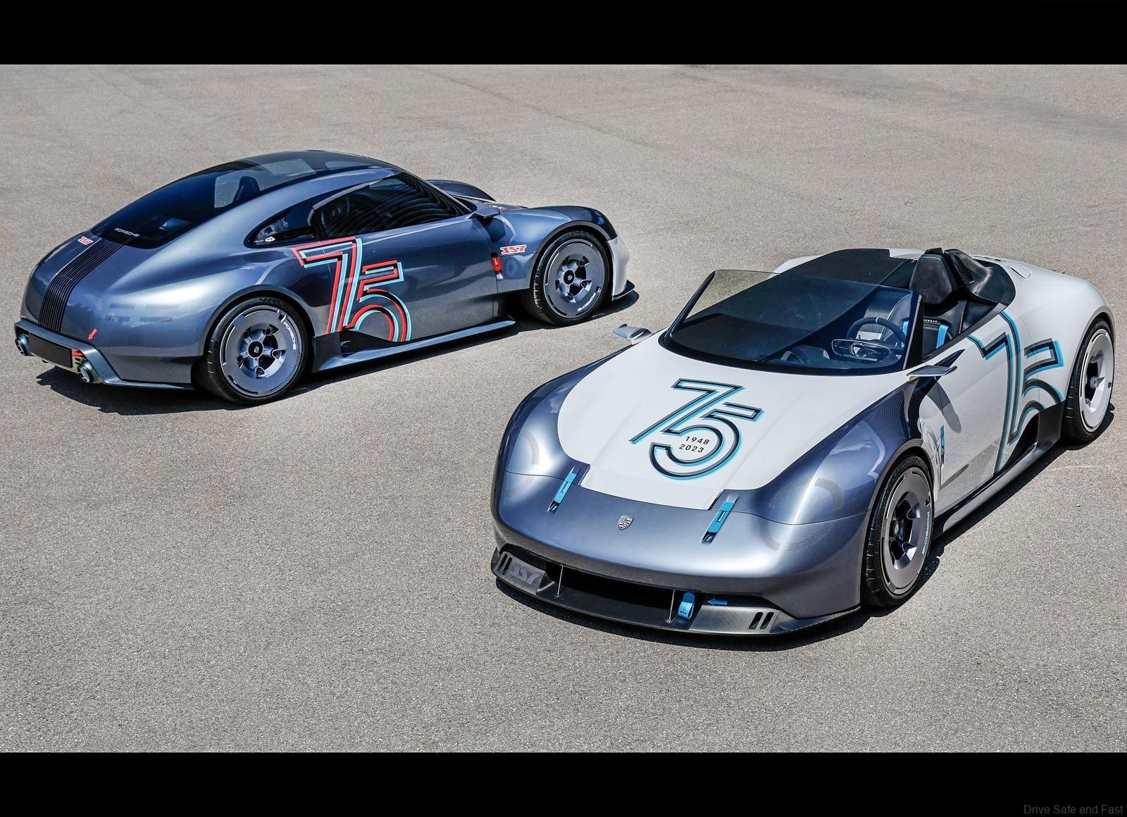 To celebrate the car’s anniversary, an exclusive logo is displayed, featuring the large number “75” and the years “1948” and “2023” in Grivelo Grey Metallic and Miami Blue. This logo replaces the previous red decorative elements found on the Vision 357 coupe. Additionally, unicorn graphics are positioned in front of the rear wheels, specially designed for this concept car by Porsche designers. The exterior mirrors are replaced by cameras, positioned further forward on the fenders, resembling wings and improving aerodynamics.