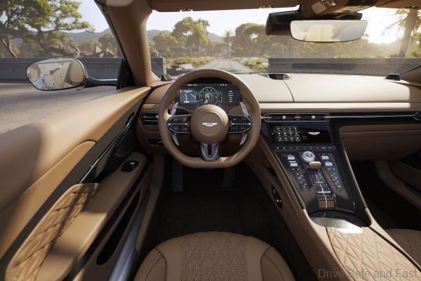 One way the Volante stands out from the coupé is that wood veneer or carbon fibre panels on the seatbacks are matched to the door trim inlay. The DB12 Volante will come with a 390w 11-speaker surround sound system that can be upgraded to a 1,170w 15-speaker system optionally. Wireless Apple CarPlay and Android Auto are standard on the 10.25″ infotainment screen.