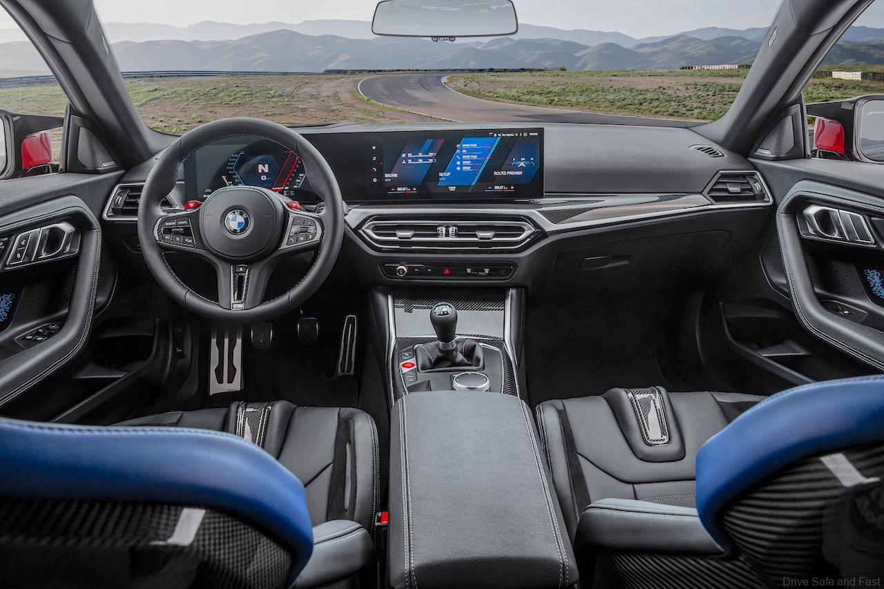 Exterior colour offerings for the two New BMW M2 variants are Zandvoort Blue, Alpine White, Brooklyn Grey, Black Sapphire and Toronto Red, while interior upholstery is available in Leather Vernasca in Black with exclusive highlight, Leather Vernasca in Black with Blue contrast stitching and Leather Vernasca in Cognac with décor stitching.