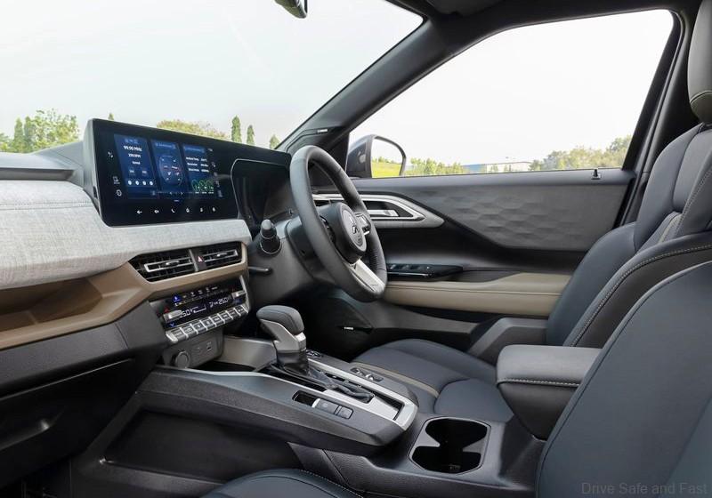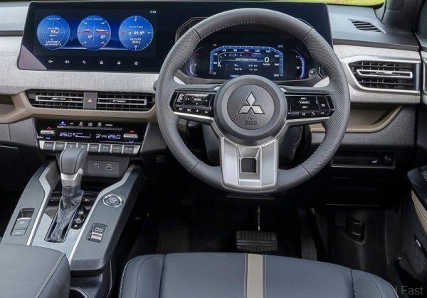 The interior is high-tech and rather interesting in this segment. Mitsubishi are employing a double digital display set-up with a 12.3″ infotainment system and a smaller driver digital display that’s recessed. The top of the dashboard utilises a blended fabric upholstery wrap for a more upmarket look. The air conditioning controls feature a mix of physical and touch-capacitive buttons and there is a digital readout. We also see a new steering wheel with many controls integrated, as well as an electric parking brake.
