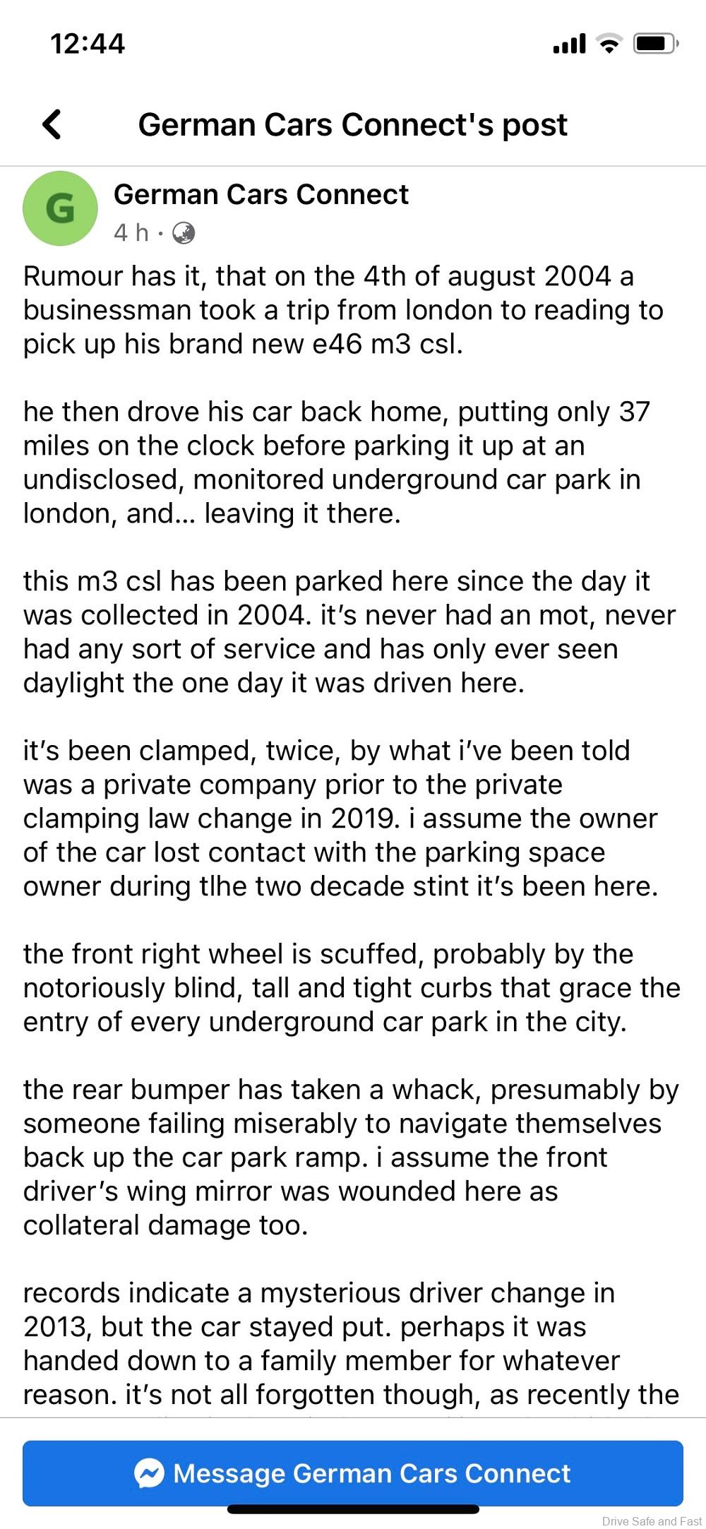 Okay, so rumour has it, that on 4 August 2004, a businessman took a trip from London to Reading to pick up his brand new e46 generation BMW M3 CSL. He then drove his new car back home, putting only 37 miles on the clock before parking it up at an undisclosed, monitored underground car park in London, and left it there.
