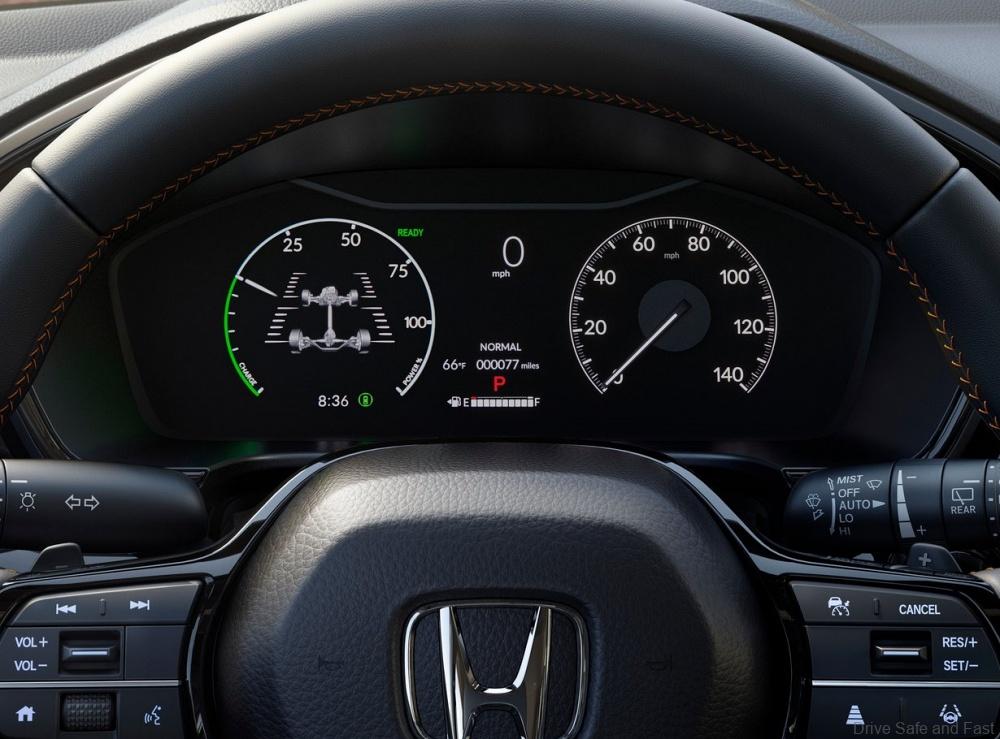 The 7-inch digital instrument panel in the 2023 Honda CR-V also features an all-digital tachometer or a digital power flow meter. The 7-inch multi-information display also features user-selectable functions such as Honda Sensing settings, vehicle information and more for safety.