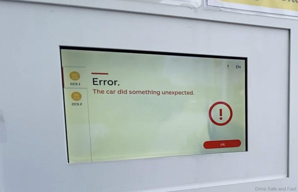 First, the message read “Charging is delayed until power is available.” Then the vehicle itself gave a “DC Charging Station Error” message. And finally, the charging station said “Error. The car did something unexpected.”