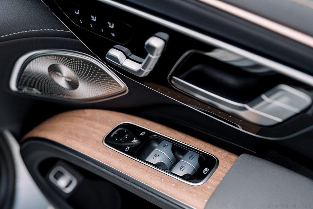 The EQS SUV is specified with the Electric Art interior with a Nappa leather upholstery in black/space grey, brown open-pore magnolia wood, Mercedes-Benz pattern in aluminium, and velour floor mats.