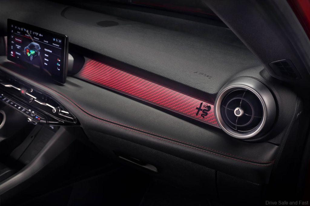 Step inside the Tributo Italiano models to experience a refined interior. The black perforated leather sports seats, featuring red accents and embroidered headrests, exude sophistication. Red stitching on the dashboard, seats, and door panels adds a touch of sporty flair. The Tonale model goes a step further with a carbon design dashboard fascia, ambient lighting, and an aluminum kick plate, creating a luxurious driving environment.