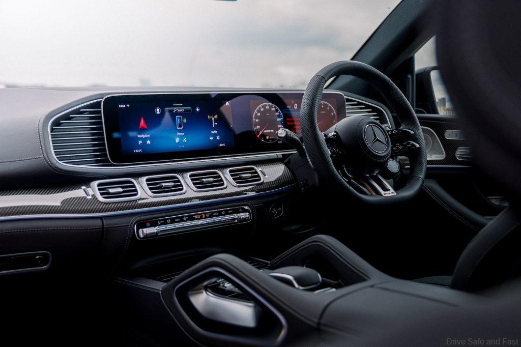 Inside the Mercedes-AMG GLE, the dynamic character continues to impress. Angular air vents with chrome louvres, inspired by the Mercedes-Maybach GLS, greet passengers as they enter. The dashboard and door beltlines in ARTICO man-made leather, along with AMG carbon-fiber trim, showcase the vehicle’s high-quality interior.