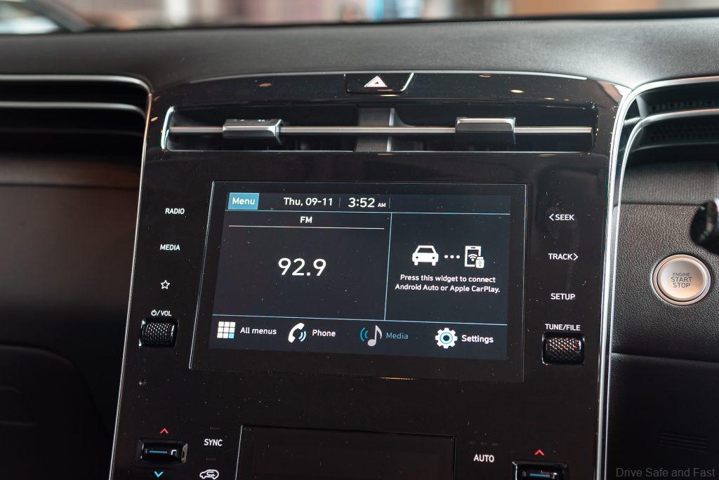 The Hyundai Tucson comes with 16″ ventilated brake discs all around as well as LED headlights. Inside, you get a 4.25″ Supervision instrument cluster, a leather steering wheel with audio controls and an 8″ infotainment system with Android Auto & Apple CarPlay connected to 6 speakers.