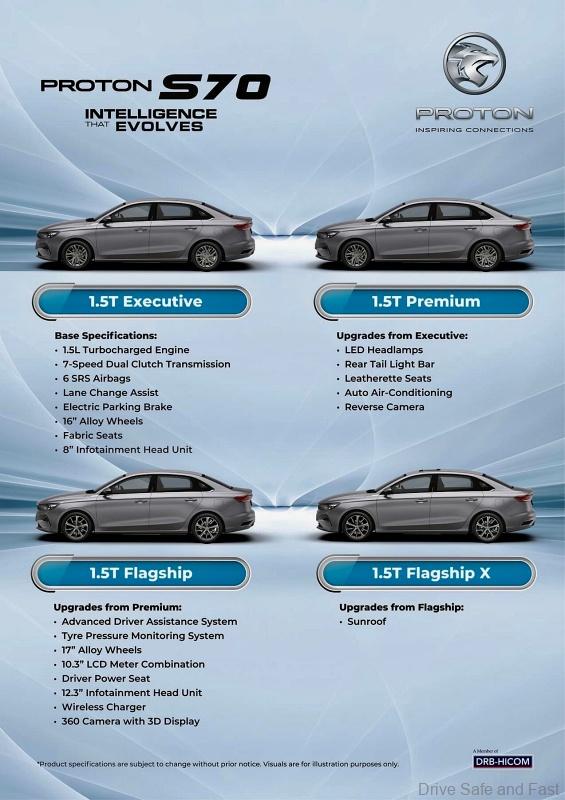 Meanwhile, the Proton S70 Flagship adds on an ADAS system, a tyre pressure monitoring system, power driver seat, a wireless charger, a 360 degree camera with 3D display, a 10.3-inch LCD driver display and upgrades the tyres to 17-inch units and upgrades the infotainment system to a 12.3-inch unit. Finally, the Flagship X adds a sunroof.