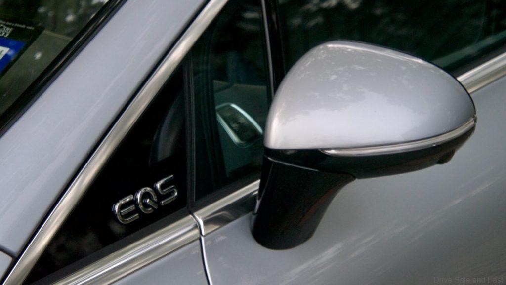 There are light strips across the front and back quite a lot of glossy black plastic. The “EQS” branding can be found on the A-pillar, which is typical in the EQ series.