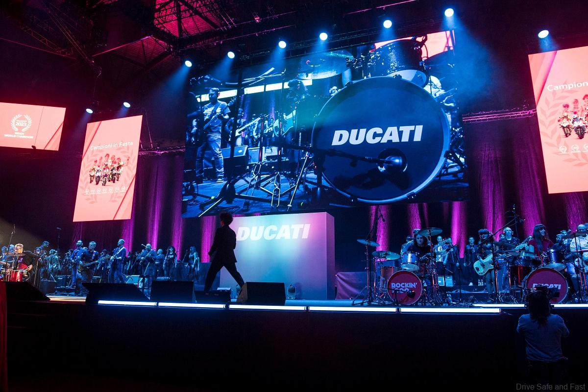 The “Campioni in Festa” show opened at 9.00 pm on Friday 15 December 2023 to the tune of Rockin’1000 music band, who for the occasion brought Power100, a selection of one hundred musicians from its international community to the stage and some of the most iconic rock songs in history accompanied the moment of the show dedicated to the overview of the unforgettable 2023 racing season.